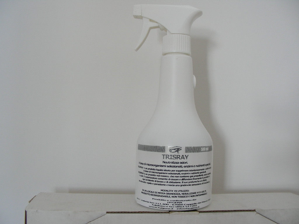 Linea presentazioneDescrizione Trispray contiene microrganismi selezionati per la digestione delle sostanze organiche. Le materie attive del Trispray utilizzano le sostanze organiche come fonte di nutrimento. Il risultato è la digestione fino alla trasformazione completa in anidride carbonica ed acqua di conseguenza viene eliminata la causa dei cattivi odori. Vantaggi · Sopprime istantaneamente i cattivi odori. · Evita l’inquinamento, apportando una carica di microrganismi estremamente attivi e benefici per il sistema cimiteriale, per l’ambiente e per gli operatori. · Sostituisce l’impiego di prodotti dannosi e corrosivi. · Ha un effetto deodorante rapido e persistente lasciando una sensazione gradevole di freschezza. · È un prodotto di facile impiego. · Prodotto naturale non pericoloso e non tossico, non contiene né soda caustica né acidi. · Buona stabilità e durata di stoccaggio. · Può essere maneggiato senza pericolo. Caratteristiche Aspetto: emulsione trasparente Odore: gradevole alla citronella Densità: 1 a 20° PH: 7,1 Biodegradabilità: Secondo le norme vigenti Tossicità: Nessuna Aggressività: Nessuna Conta batterica: U.f.c..: 2x10 all’ottava (200.000.000) Metodologia · Applicare il prodotto mediante nebulizzazione il più vicino possibile alla fonte dei cattivi odori e nell’ambiente. Si ottiene la totale eliminazione dei cattivi odori all’interno della sala veglia. · Trispray viene utilizzato anche negli ambienti cimiteriali come neutralizza odori all’interno dei loculi, nei rifiuti da esumazioni, nei depositi e nei rifiuti cimiteriali in generale. · Non impiegare contemporaneamente ai prodotti biologici sostanze come: acidi, soda caustica, candeggina, disinfettanti ecc…. Sicurezza – Etichettatura · Prodotto da immagazzinare in luogo asciutto ad una temperatura superiore a 0°C, evitando l’esposizione prolungata a temperature superiori a 40°C In queste condizioni, l’attività biologica è garantita à richiudere bene la confezione dopo l’uso. · Evitare il contatto con gli occhi e non ingerire. · Lavarsi accuratamente le mani con acqua e sapone dopo la manipolazione del prodotto. Condizioni di impiego pH di utilizzazione: 5,5 – 8,5. Temperatura di utilizzazione: 5 – 45°C. Dosaggio Pronto all’uso
